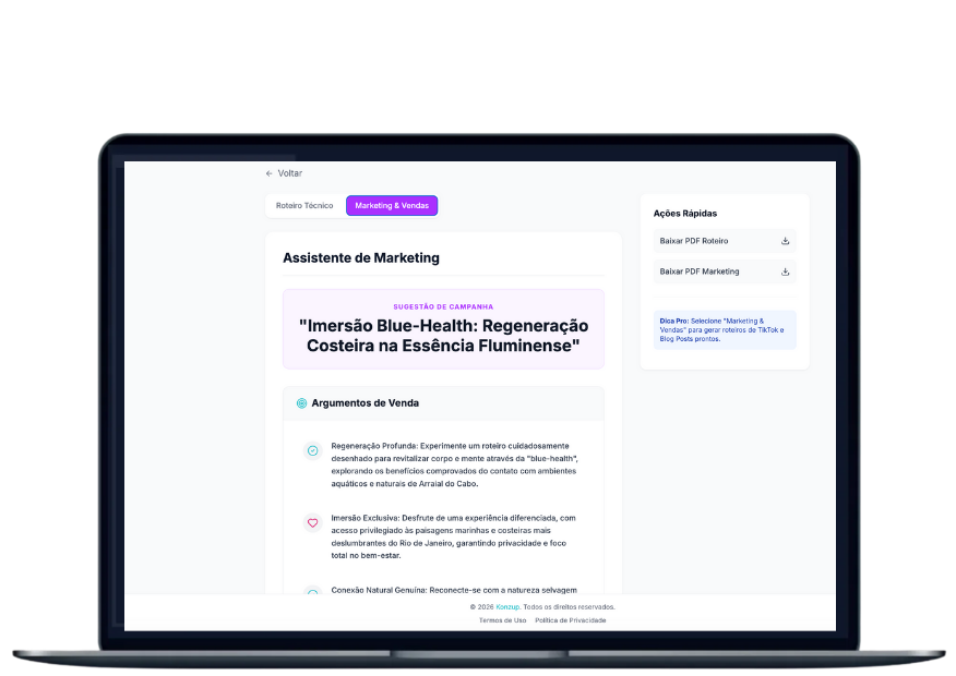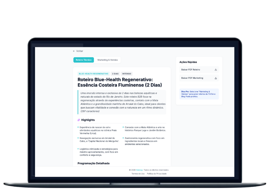 A Konzup Rio web possui uma IA que fornece dicas de vendas e marketing para cada roteiro gerado. Isso ajuda agências e guias a promoverem suas ofertas de forma mais eficaz, aumentando o engajamento e as vendas.